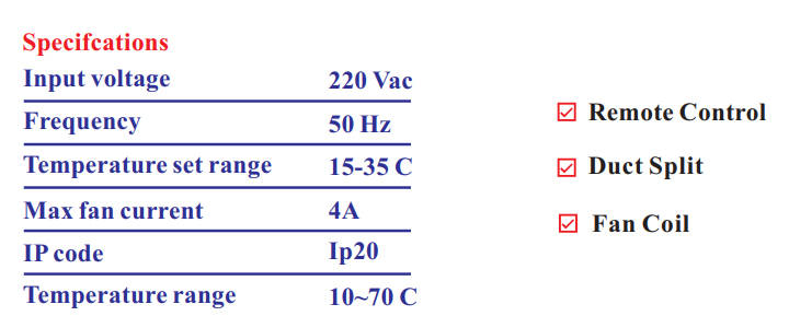 جهت نصب روکار و مناسب کنترل انواع فن کویل و داکت اسپیلت، گرمایش از کف و… بر مبنای دمای مطلوب می باشد.